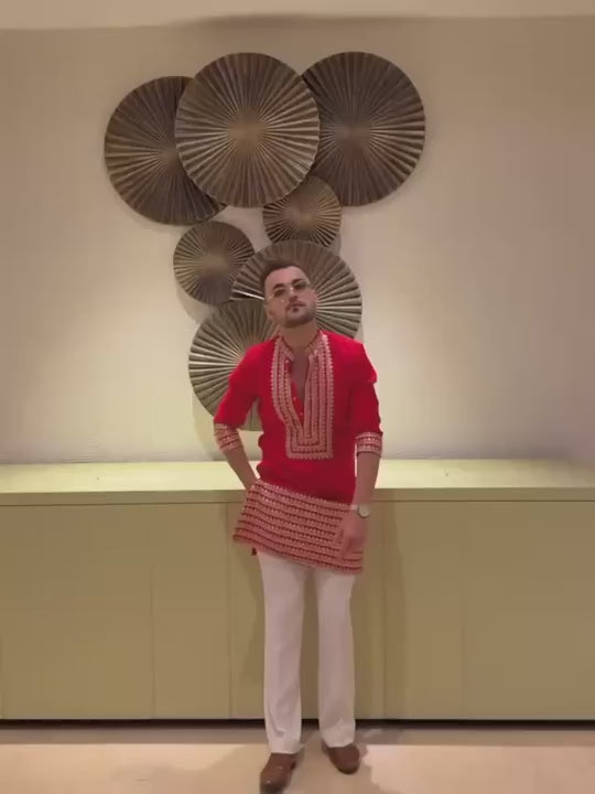 This RED Neck and Butti Embroidered Work Men's Kurta with PajamaIs Created by Raabta Atelier ,This Hand-stitched Kurta Is Made of 100% Pure Rayon Cotton ( 22kg ) Fabric With Having embroidered work Over It. Our Attractive embroidery Add More Charm to Your Look, Wear This at Any Time Because the Fabric Is So Smooth to Skin That You Will Love It.